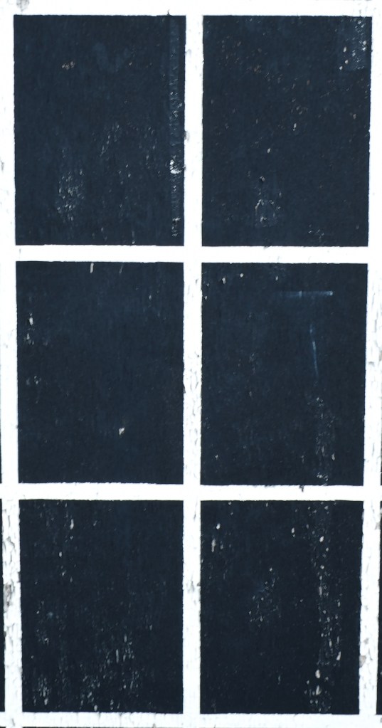 I was going to write at some length about these shots but decided against it. Look at each as if it were a painting. In some, the editing transforms the contents of each window pane into deliberate, loose brush strokes, forming multiple pictures within the overall image. In others, the calm and order of the grid of dark panes is disrupted by the violent contrast of the white that traces sections of the grid here while disrupting the organisation there. In others, the lesser contrast allows the invasive white shadowing to complement rather than disrupt the grid.