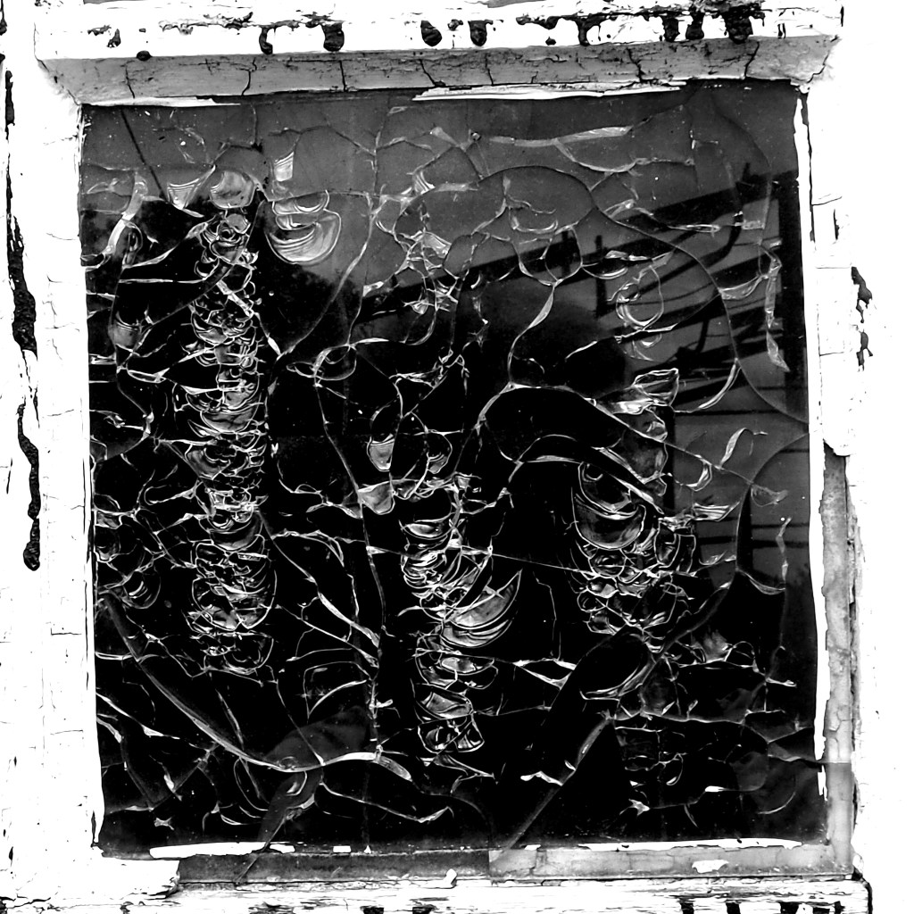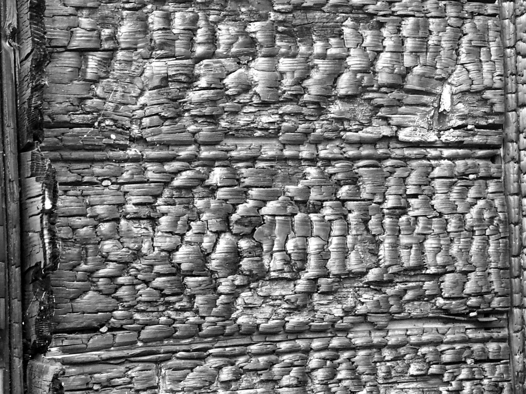 The textures and intricate shapes found in the detail of ruin can be beautiful, the tracery of fracture in the broken glass in the top picture and the charred wood above, which reminds me of rough-woven wool.