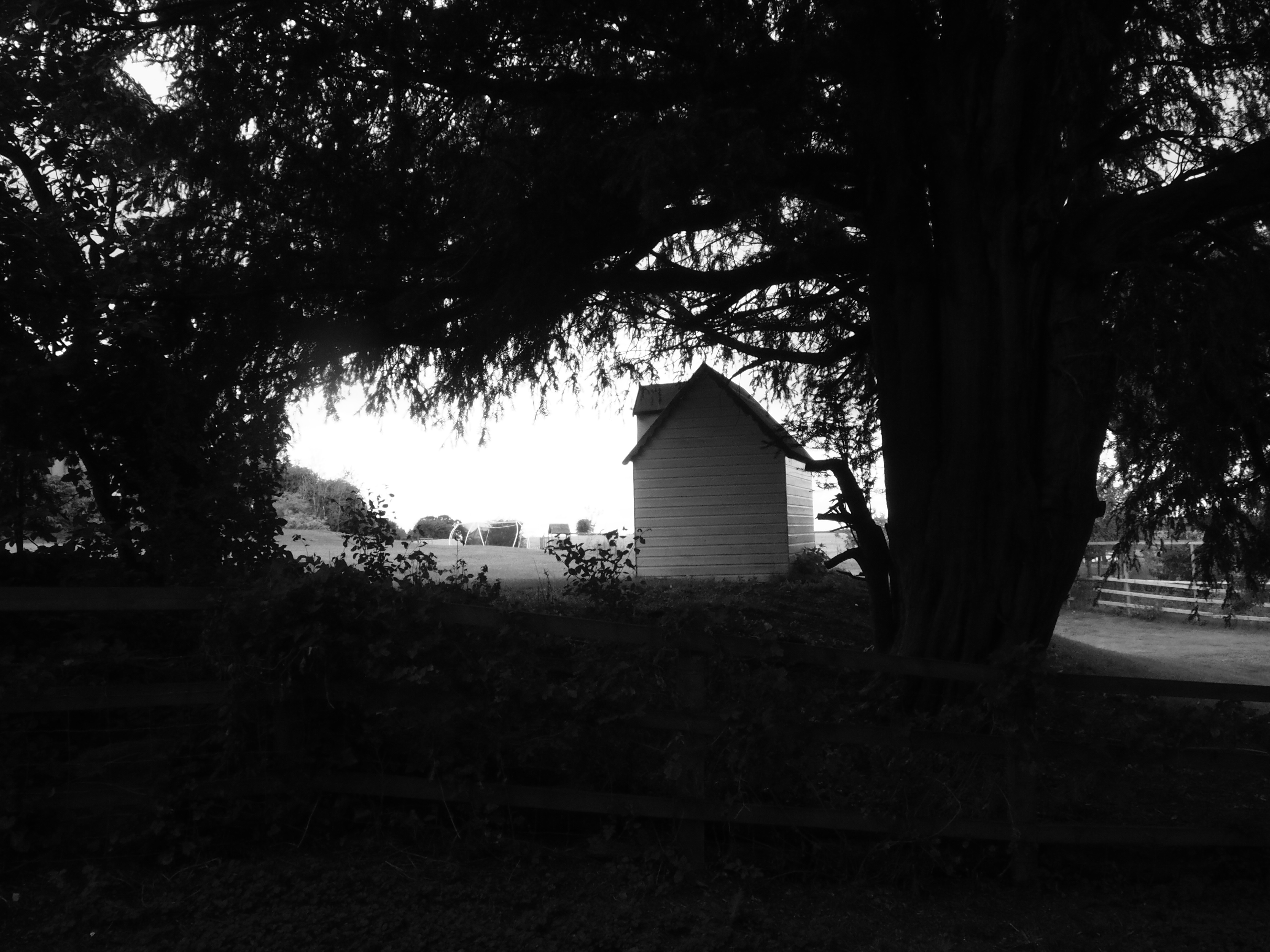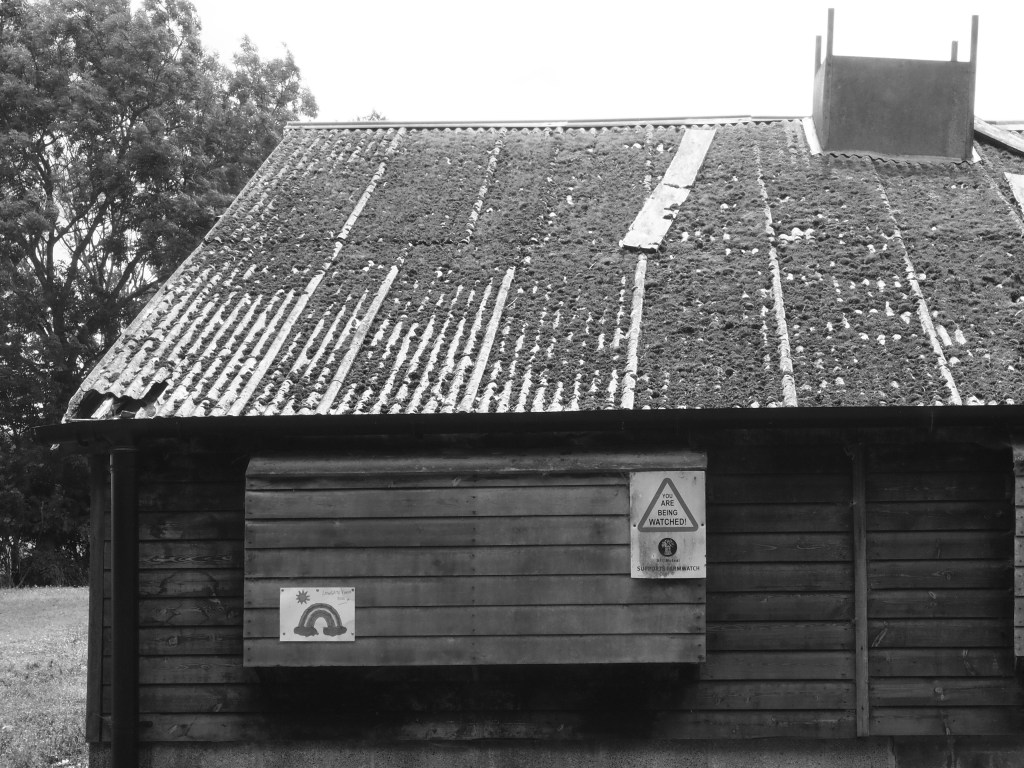 A derelict battery hen farm haunts one end of the hamlet, reminiscent of a concentration camp. The child’s NHS rainbow drawing is incongruous, pinned to one of the battery barns, next to a CCTV warning notice.
