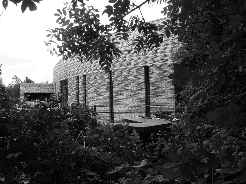 But one building does stick out. The initial reaction is ‘what on earth is that?’ It certainly doesn’t blend in with its neighbours. Yet, while it demands attention and you may like it or not – I’m undecided – it’s not an eyesore. But what is it? With its size, thin grey brickwork, tall and narrow windows and curved construction, my guesses were the self-aggrandising offices of a financial adviser for the well-heeled of East Herts or a trendy new crematorium. But as there is no corporate or council signage and no pin on Google Maps, I suppose it must be residential. Let me know if you know.