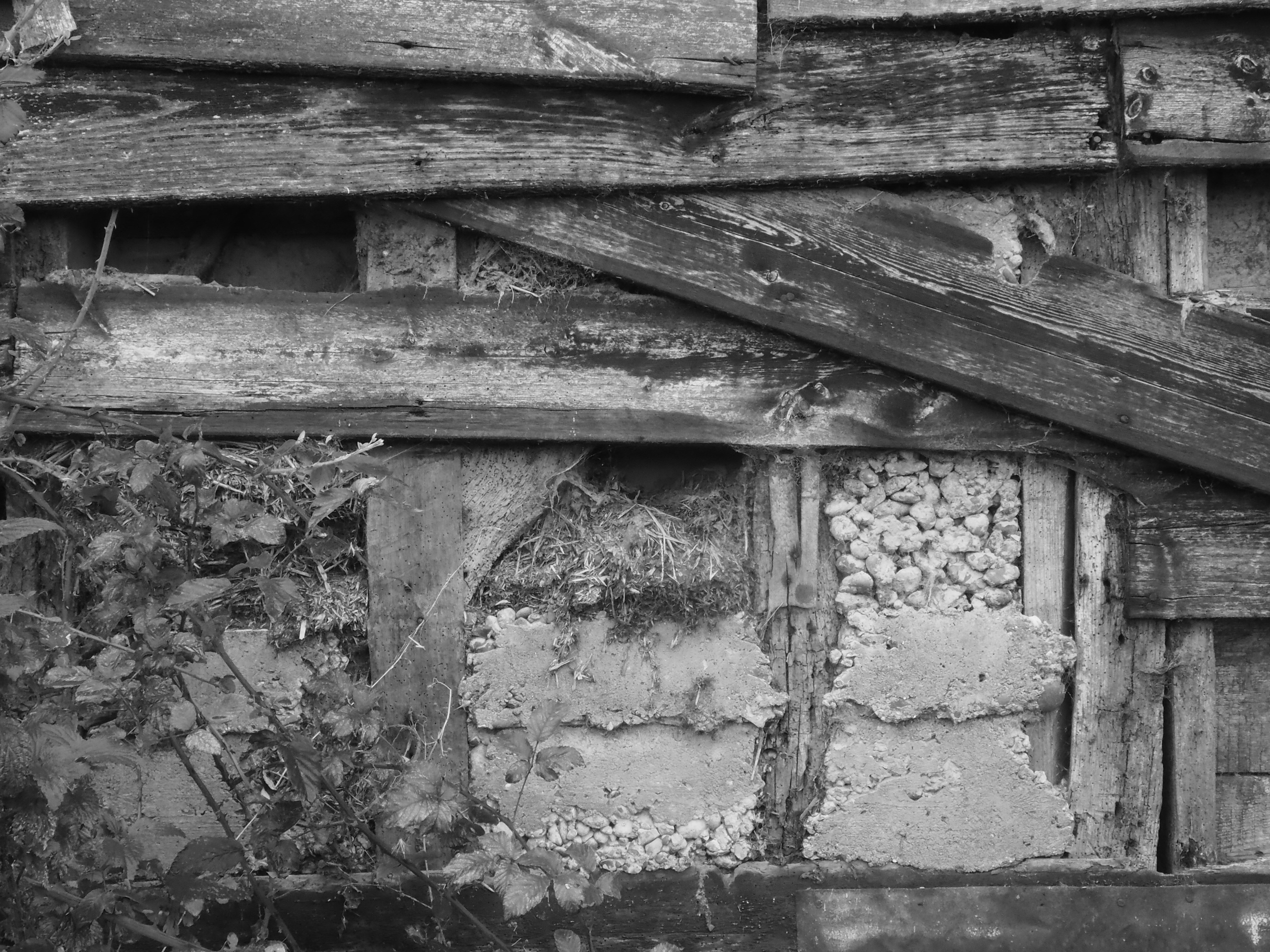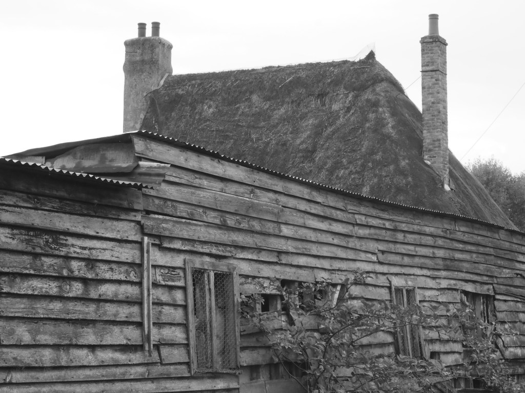The current farmhouse was built in the late 16th or early 17th century and is a listed building. It has a steep, thatched roof, tall chimneys, casement windows, whitewashed walls, and a long, much-patched clapperboard barn.