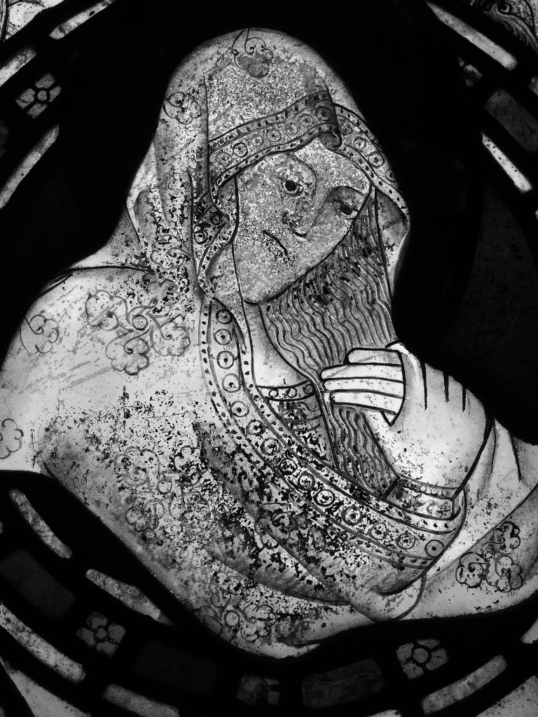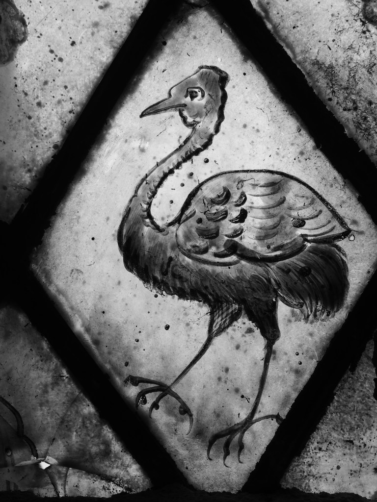 Behind the altar are three late medieval stained glass windows containing dozens of beautifully rendered birds, some of familiar species, some of species no longer seen in England, and others that you wonder how the craftsmen knew of their existence (see the ostrich or emu or rhea of whatever below). I haven’t attempted to do them justice, only giving you a taste to encourage you to visit.