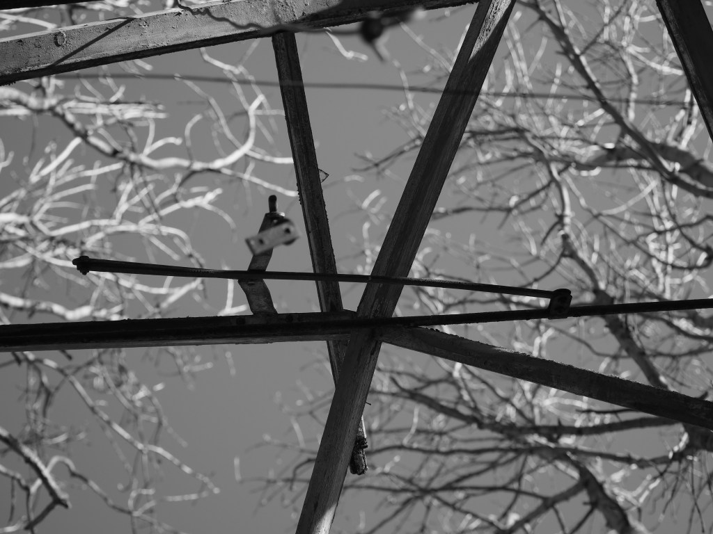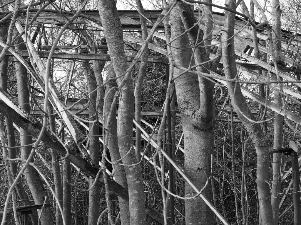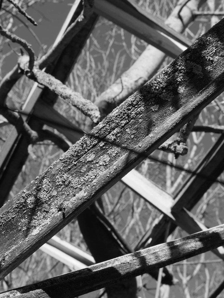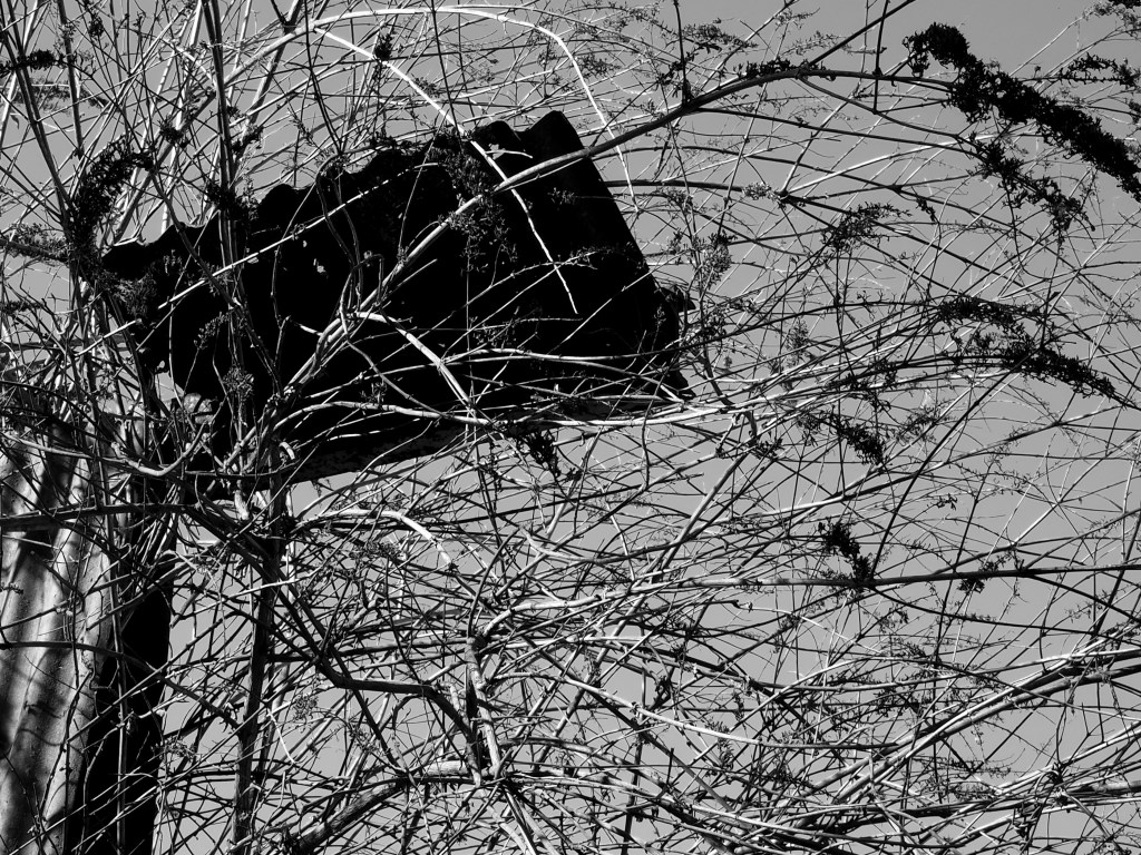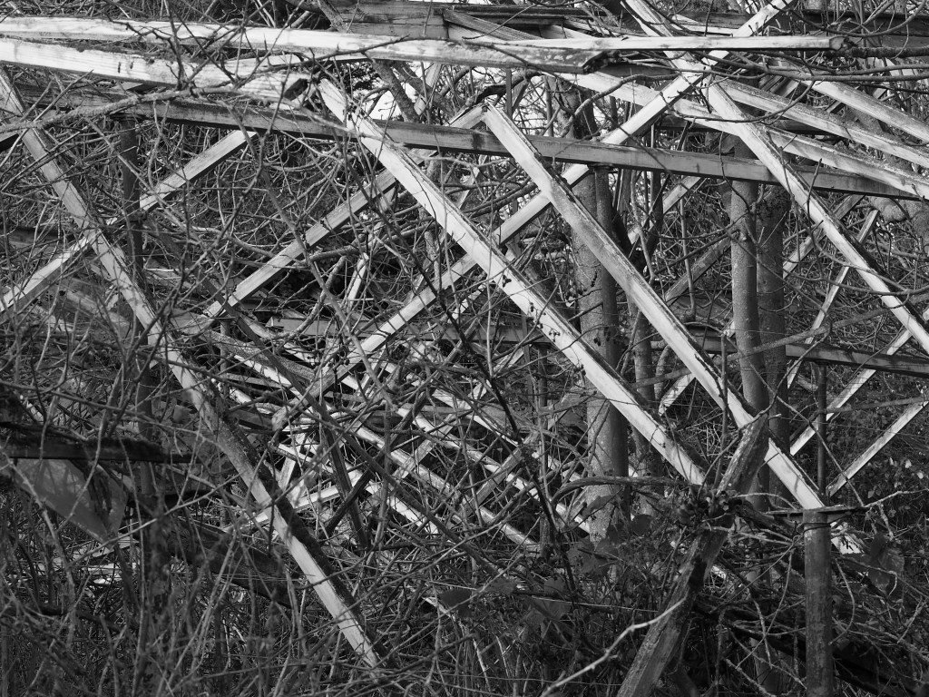 The patch was cleared to put up the commercial greenhouses. Decades later, the greenhouses failed and spiralled into disrepair. The vegetation is reasserting its claim. For now, there is stasis with neither the manmade structure nor nature prevailing. At this moment – which may end with Spring growth – the measured angles and straight lines of the collapsing artifice are interwoven with an unruly growth decided by wind, rain and sun, sometimes complementing, sometimes clashing.
