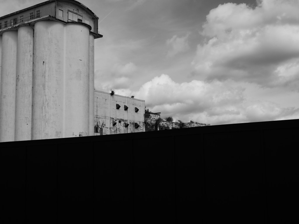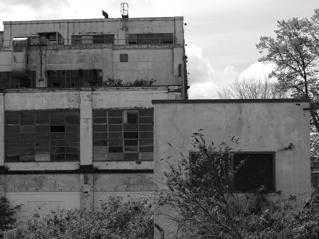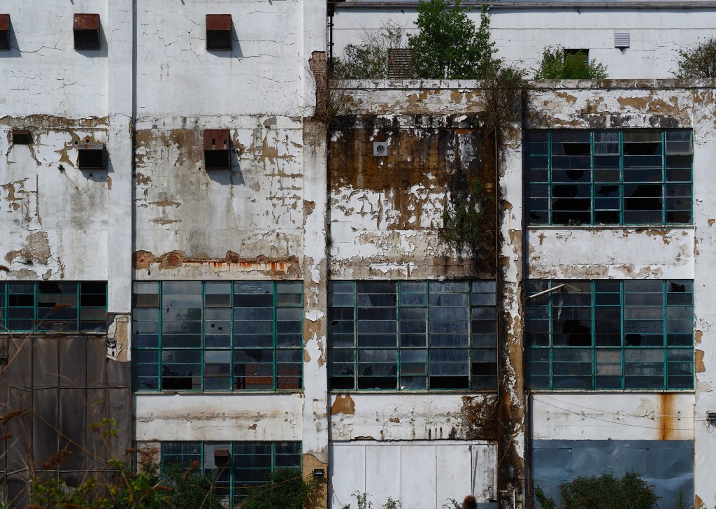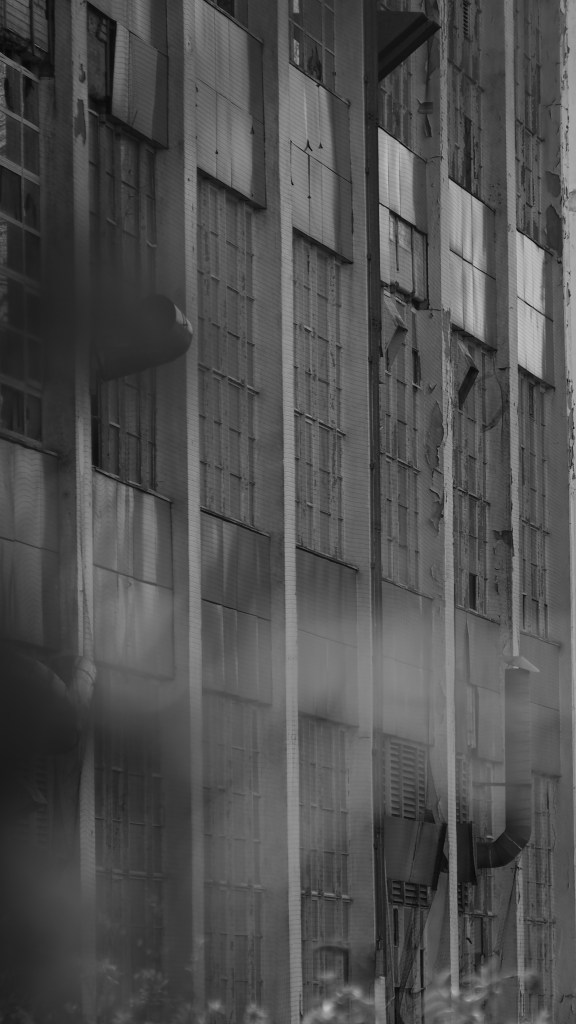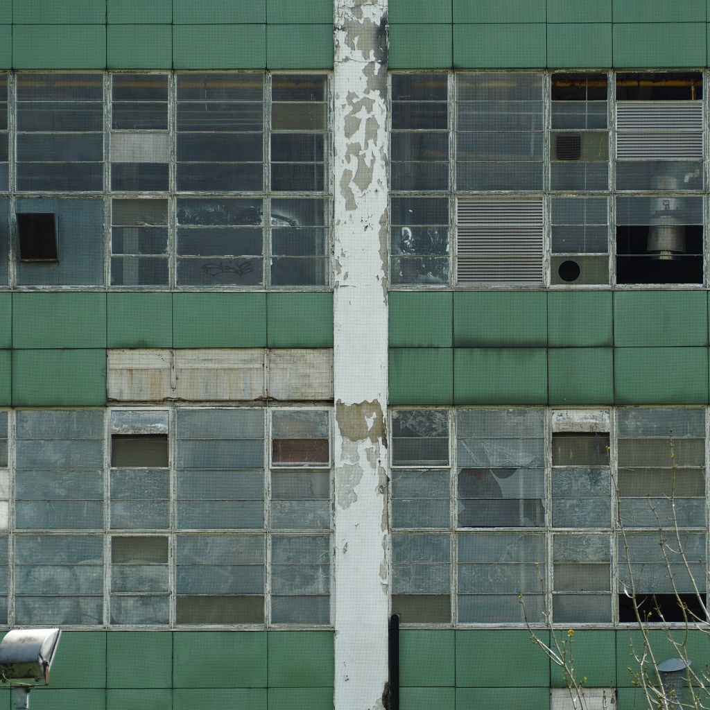 The Shredded Wheat factory at Welwyn Garden City was designed by architect Louis de Soissons in 1925. A walk around the site ahead of complete demolition yielded some shots of the the remains of an iconic building that ranks among the best examples of early 20th century industrial architecture. As it peels and crumbles it offers new ways of looking. With a flattened depth of field, the window panels and shattered panes, the distressed paintwork, and the broken screening can be viewed as abstract, accidental constructs. They are dynamic, changing with every blast of wind, act of vandalism, or water leak that precedes the wrecking ball. Stand back and look at the remaining buildings. Flatten the perspective. The design and the materials and construction techniques render the factory as collections of planes and panels, juxtaposed here, overlapping there.