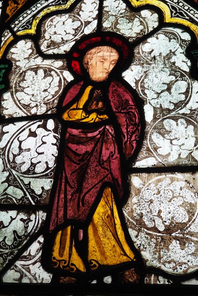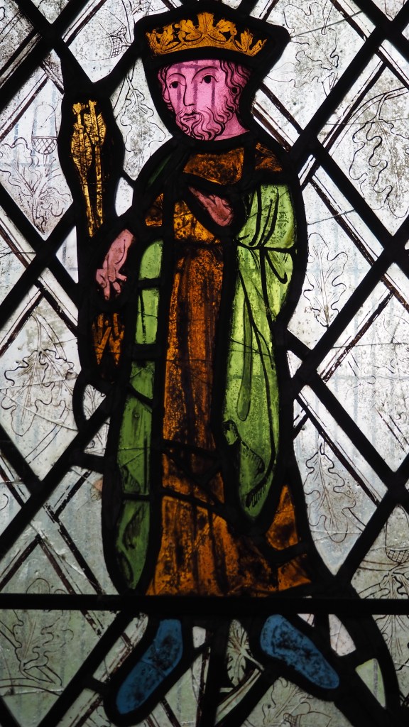 The figure of St Edmund – Saxon king of East Anglia and original patron saint of England – and another saint at Edworth date from the 14th century. Each is surrounded by motifs of leaves and acorns of English oaks, rooting the subjects to the land.