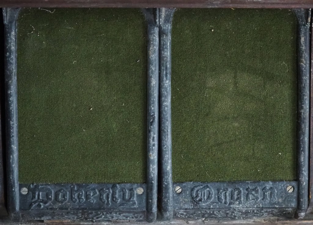 The pedals of the Doherty organ at Caldecote. No longer functional, the organ may be the most exotic item in the church, Doherty’s being a Canadian organ maker of the 19th and early 20th centuries.