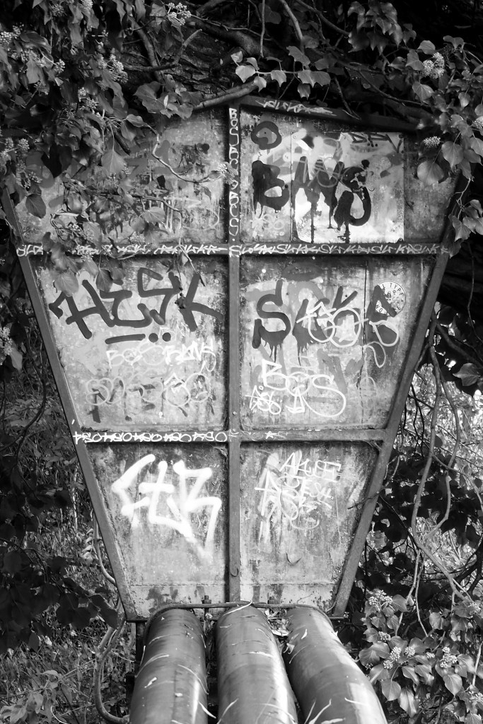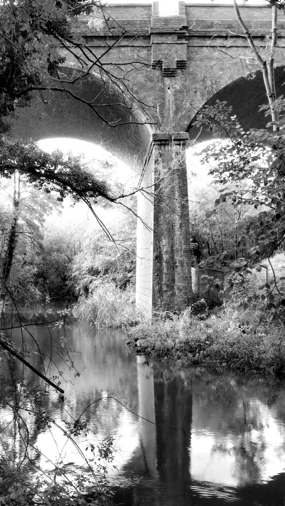 The end stretch of the Mimram takes it under another railway viaduct, this one carrying the Hertford Loop line. It’s an impressive structure but put in the shade by the one at Digswell. Then the river briefly knocks up against the edge of an industrial estate with attendant pipework and graffiti.